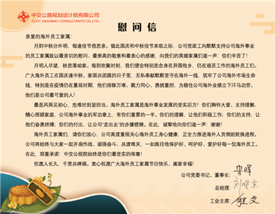 公司黨委書記、董事長宋暉,總經(jīng)理、總工程師劉曉東,黨委副書記、紀委書記、工會主席程文通過慰問信的方式向公司所有海外員工及家屬送上節(jié)日的祝福,對家屬給予公司及海外員工的支持和理解致以衷心感謝。