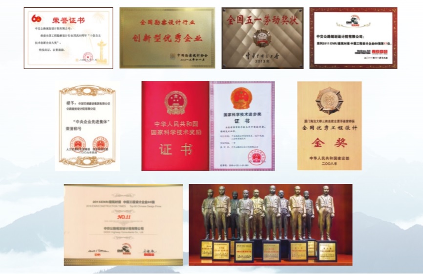 六十年來(lái) , 公司在公路橋梁勘察設(shè)計(jì)、標(biāo)準(zhǔn)規(guī)范、定額編制、技術(shù)咨詢(xún)領(lǐng)域榮獲國(guó)家級(jí)和省部級(jí)獎(jiǎng)項(xiàng)多達(dá) 300 多項(xiàng) , 其中有“國(guó)家科學(xué)技術(shù)進(jìn)步獎(jiǎng)”、“全國(guó)優(yōu)秀工程設(shè)計(jì)獎(jiǎng)”、“中國(guó)土木工程詹天佑大獎(jiǎng)”、“國(guó)家優(yōu)質(zhì)工程獎(jiǎng)”、“中國(guó)建筑工程魯班獎(jiǎng)”等。國(guó)際橋梁大會(huì) (IBC) 頒發(fā)的“喬治·理查德森獎(jiǎng)”、“尤金·菲戈獎(jiǎng)”、“古斯塔夫·林德薩爾”等更讓公司走向了世界。公司堅(jiān)持創(chuàng)新,獲得“全國(guó)勘察設(shè)計(jì)行業(yè)創(chuàng)新型優(yōu)秀企業(yè)”、“全國(guó)建筑業(yè)技術(shù)創(chuàng)新先進(jìn)企業(yè)”、全國(guó)工程勘察設(shè)計(jì)行業(yè)國(guó)慶 60周年“十佳自主技術(shù)創(chuàng)新企業(yè)大獎(jiǎng)”等,獲得“中國(guó)交通建設(shè)十大橋梁英雄團(tuán)隊(duì)”、“國(guó)家科技計(jì)劃執(zhí)行優(yōu)秀團(tuán)隊(duì)獎(jiǎng)”、“中央企業(yè)先進(jìn)集體”等殊榮 , 獲得中華全國(guó)總工會(huì)頒發(fā)“全國(guó)五一勞動(dòng)獎(jiǎng)狀”,被授予全國(guó)文明單位、首都文明單位等榮譽(yù)稱(chēng)號(hào)。